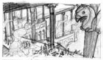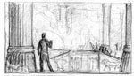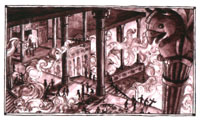 | Sketches for the plundering and burning of Persepolis: I tried out various perspectives until I found a suitable one, as it was supposed to show both the splendour as well as the destruction of the city. | |