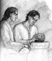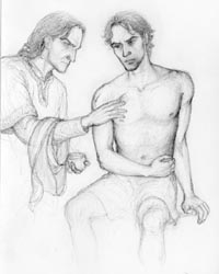 "Tending the Healer" (2007) Wounded during battle on the corsair-ship while guarding his captain Faramir, the Ranger Dorgil (actually the healer of the company) is in need of treatment, so Faramir tends to him. From The Snake's Checkmate. |
