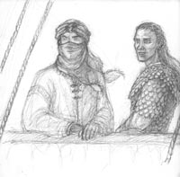 More sketches for The Snake's Checkmate (2007) Sketches of Faramir and the corsair Azrubâr (entitled "Farewell to Gondor"), and Faramir in Haradaic garments during a sea-battle, from The Snake's Checkmate. |